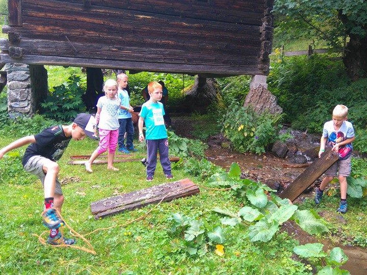 ...und weil unsere Fahrt auf die Dolzer-Alm jede Woche so erfolgreich ist, fährt je nach Wochenprogramm auch manchmal das Kinder-Animationsteam mit. "Kids-Adventure-Trail" oder aber auch "Benele-Adventure" (nach unserem echt gruseligen Hausgespenst) steht dann in diesem Fall im Wochenprogramm. Während dann die Eltern gemütlich vor dem 400 Jahre alten Haus die Sonne und das Rauschen des Baches genießen, lernen die Kleinen das eine oder andere über Alpenkräuter oder Ameisenhaufen und bauen eine Brücke über den reißenden Gebirgsbach...